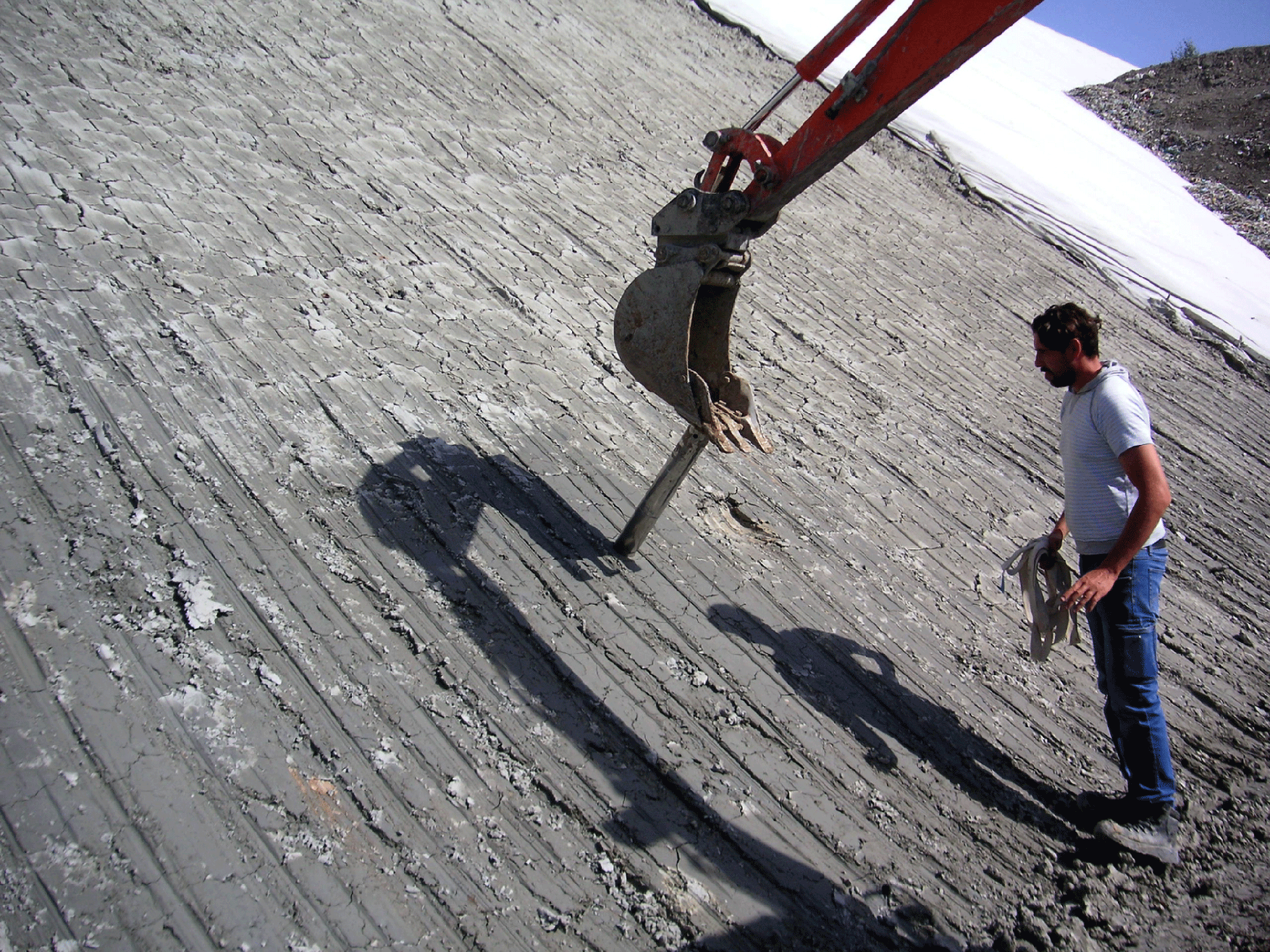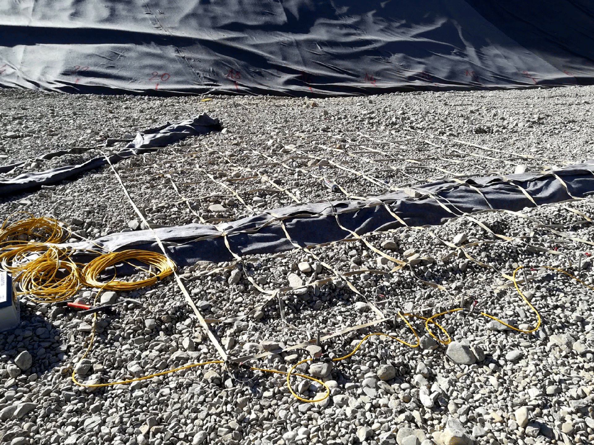 Prospezione geoelettrica del telo HDPE; atraverso questo sistema vengono individuate eventuali lesioni del telo procurate dopo la posa dello strato drenante.