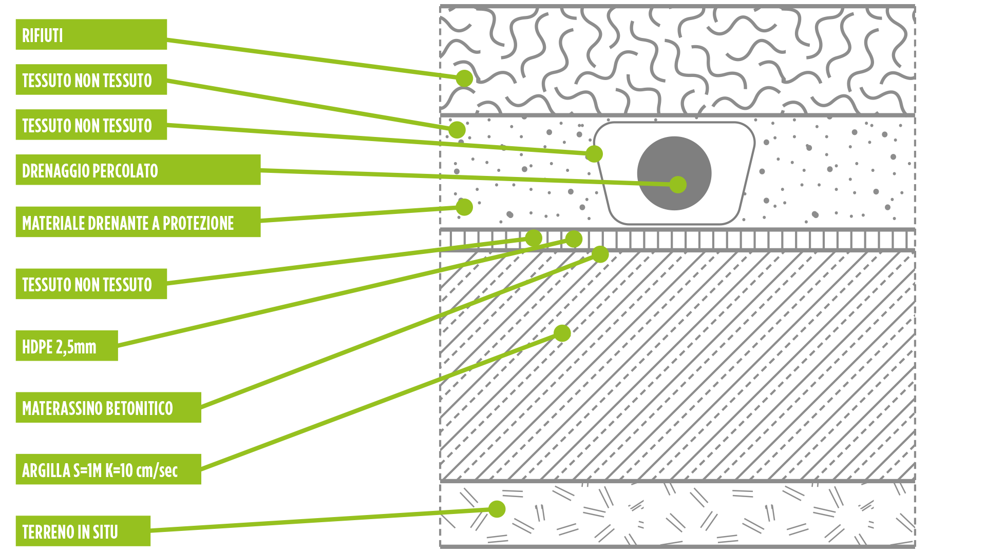 Al fine di garantire il completo isolamento delle acque profonde, viene isolato il fondo della discarica e le sponde dello scavo con materiali impermeabili. Questa barriera deve resistere agli sforzi indotti per evitare eventuali collassi o malfunzionamenti delle sue componenti. Evita fenomeni di inquinamento ambientale dovuti a sversamento di liquami di percolazione.