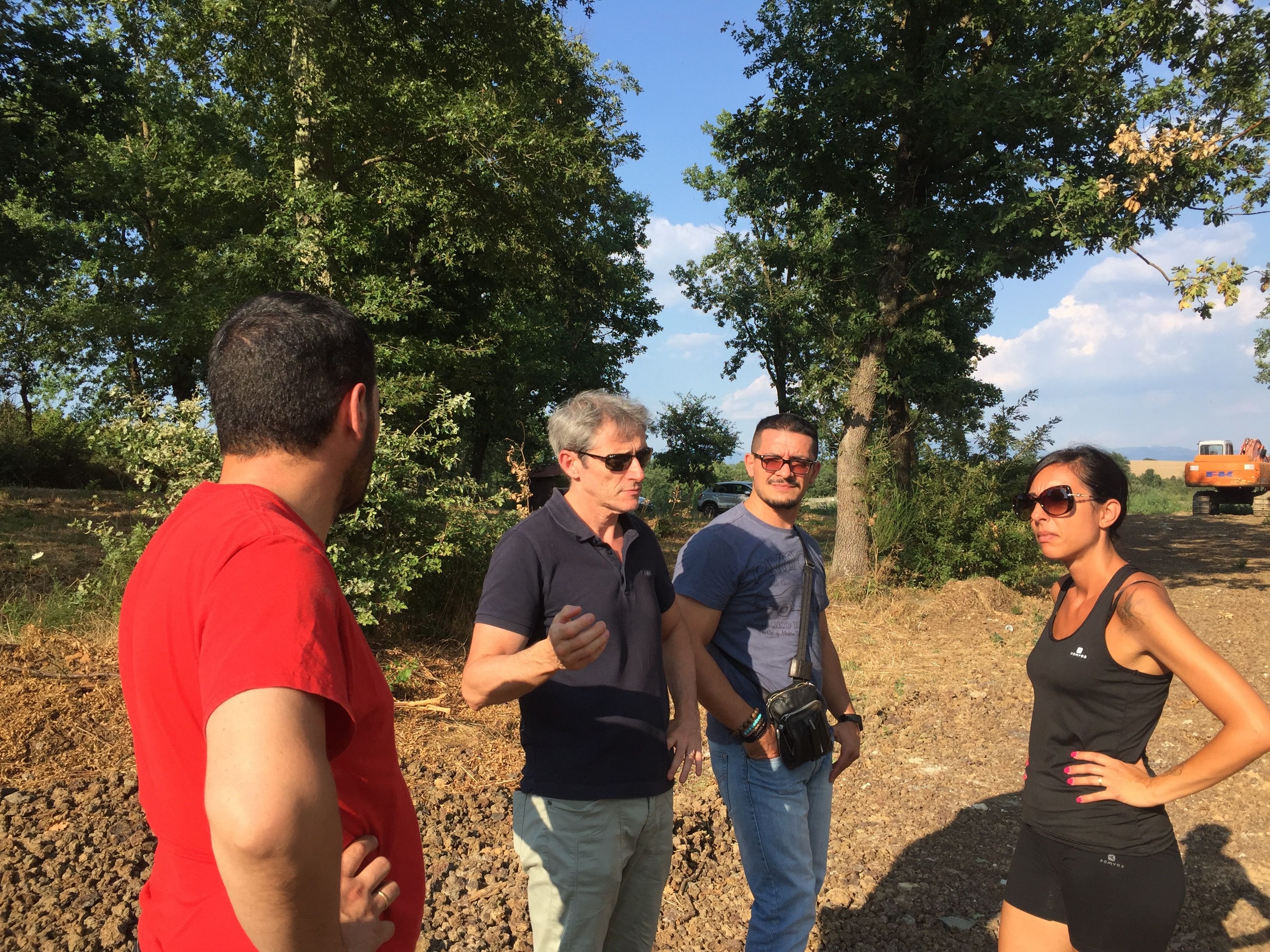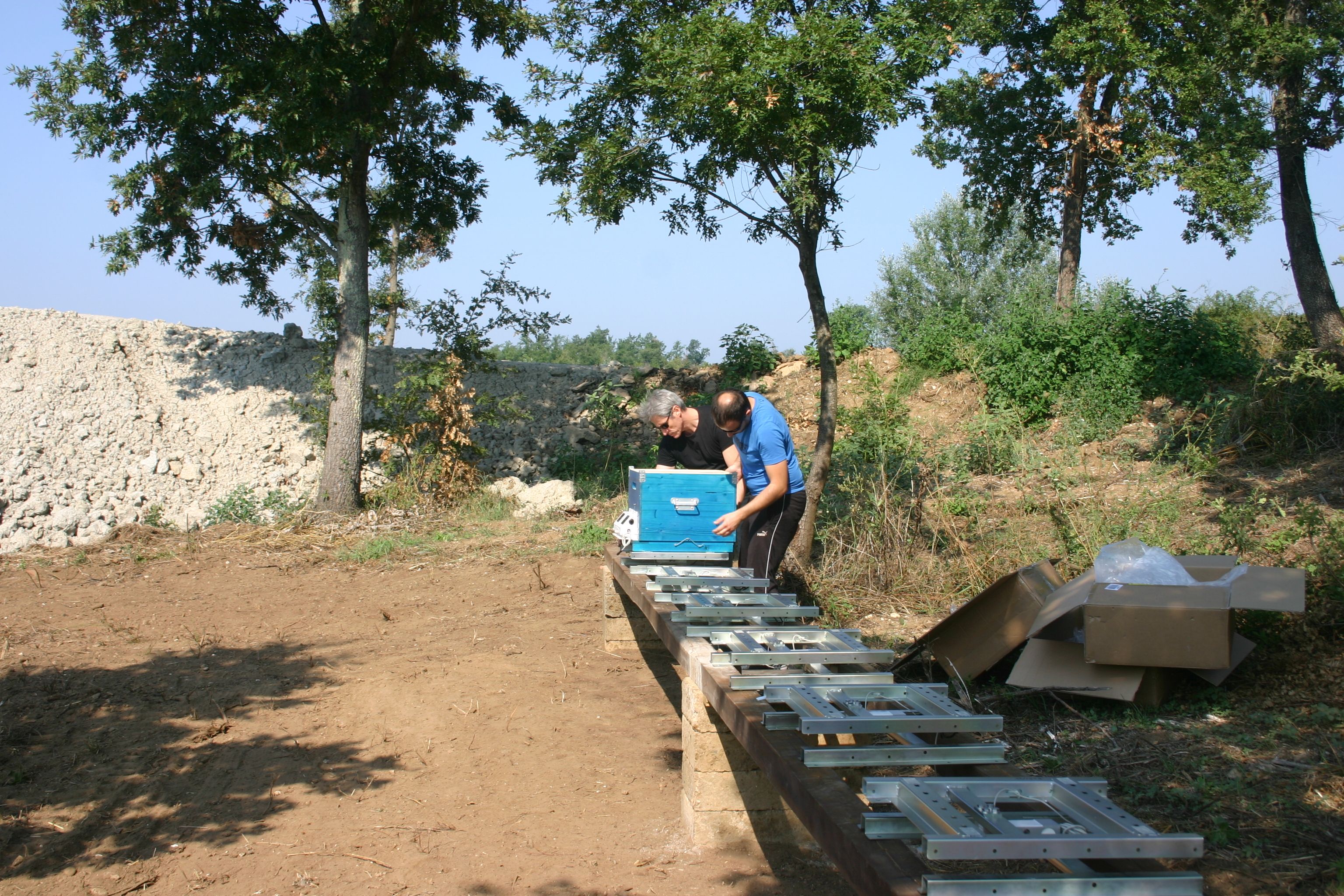 Dopo diversi incontri preliminari, nel torrido pomeriggio del 31 Luglio ci si incontra per decidere la collocazione strategica degli alveari. Sul posto i ricercatori Pier Paolo Danieli e Roberto Bedini insieme a Leonardo Manfredini, esperto apicoltore, decidono posizione ottimale e esposizione delle colonie di Apis Mellifera Ligustica Spinola, anche nota come Ape Italiana. La settimana successiva, il 7 Agosto, verranno posizionate le arnie. Sono arnie sperimentali, dei tipo Italica Dadant da 10 favi, censite nella Banca Dati Nazionale Anagrafica Apistica, sono intelligenti, attrezzate di sensoristica, alimentazione autonoma e di connessione alla rete dati. Tengono costantemente sotto controllo il peso dell’alveare, la temperatura interna, l’attività dei voli (conta voli), la pioggia; questi dati vengono analizzati al fine di evidenziare eventuali anomalie; trend di riduzione della riproduzione, sull’accumulo di scorte, effetti sulla demografia delle colonie ecc. potenzialmente riconducibili alle attività che si svolgono in area.